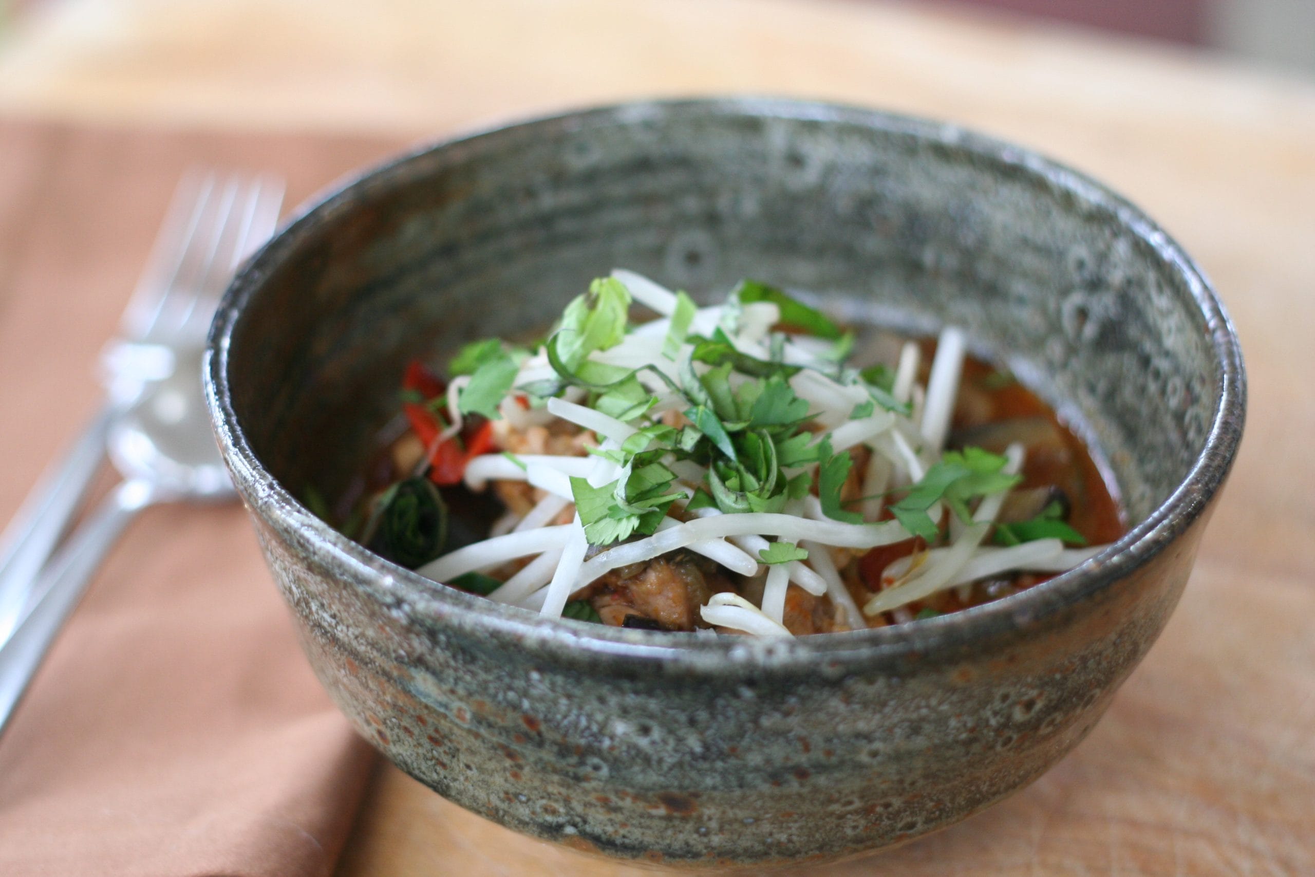 If you want to serve the dishes for dinner the evening of the class, I suggest you keep it simple and make a green salad or green vegetable of your choice. The soup is a main course and includes chicken, vegetables, and rice noodles. The salmon cooks in a coconut milk sauce.